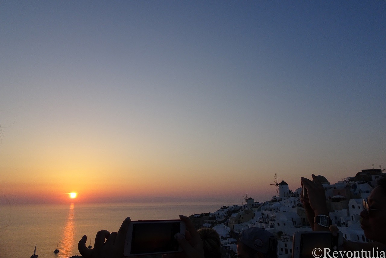 これだけ混雑して人を見るのが嫌になるくらいですが、さもありなんかな、サントリーニ島から見た夕焼けは本当に美しいです。